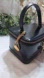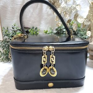Stunning black train vanity case with gold colored hardware. Also comes with the Medusa charm. Double zipper that zip 3/4 way around the bag. Inside the case has an additional slip pocket. On the inside top, there is a snap close mirror that tucks away for easy storage and access. There is also a little pocket on the back side as well. This little case is classy. The exterior is in great condition. There is one scratch on the front of the case that blends in with the bag.