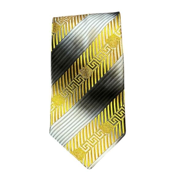 featuring a baroque design with stripes in yellow, gray, and black silk twill. The tie incorporates iconic Versace elements such as the Medusa head and Greek key patterns. It is made in Italy from 100% silk.