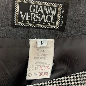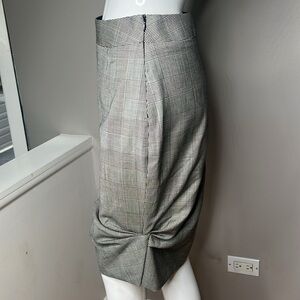 This is a beautiful Gianni Versace Sz 38 US 4 Check Pencil Knee Skirt 100% Wool. Scrunched side and front. Excellent condition. No issues at all. No odors. No stains. Side slit at the side scrunch.