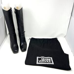 Step into iconic Y2K style with these vintage Gianni Versace black leather knee-high boots, a true collector’s piece for any fashion lover. Crafted in Italy with the unmistakable quality and edge of the Versace house, these boots feature smooth, supple black leather, a structured square toe, and a bold block heel for confident lift and posture.