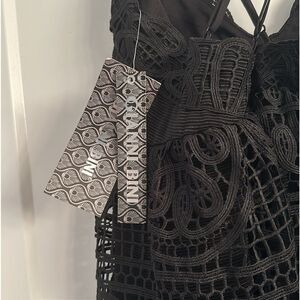 NWT Beautiful Gianni Bini Black Lace Monica Dress perfect for date night or any dressy occasion. Black Lace with jaquered •Peplum waist •Sweetheart neckline •Zipper closure on back with jacquard and lace fabrication •Adjustable spaghetti straps that criss-cross at back •Lined •65% cotton, 35% nylon