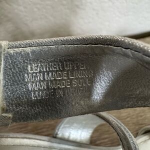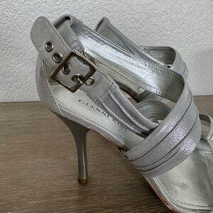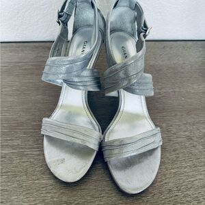 Women’s size 8.5 Gianni Bini silver metallic sparkling genuine leather stiletto heels in good preowned condition. Shows normal overall wear as seen, no major flaws or damage.