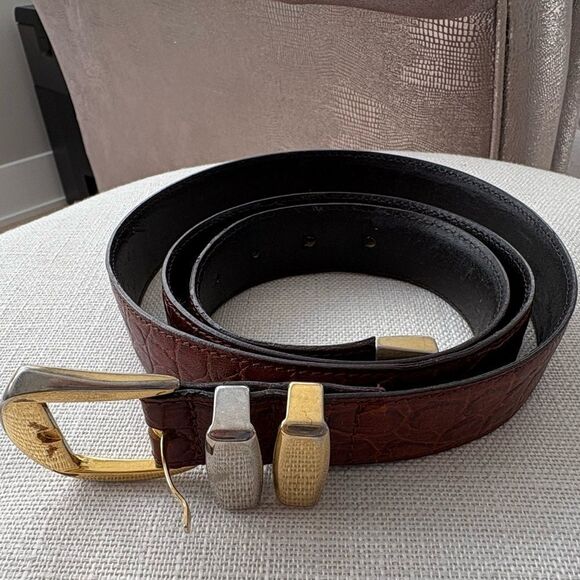 Description: Authentic vintage Gianni Versace brown croc-embossed leather belt with dual-tone hardware (gold & silver). Stamped Made in Italy SC2 • 110/44. Statement belt—pairs with denim or suits.
