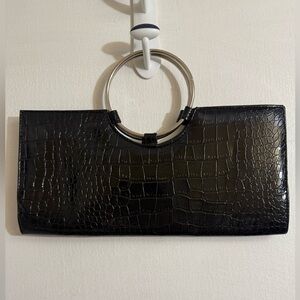 Elegant black clutch featuring a crocodile-embossed design and a stylish silver ring handle. Perfect for adding a touch of sophistication to any outfit.