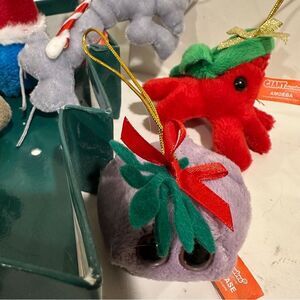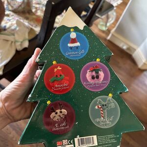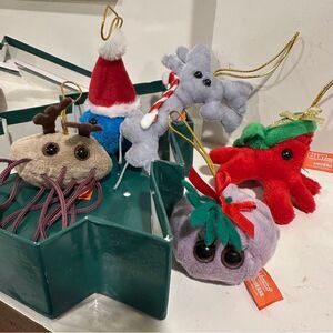 5 germs festively dressed up for the holidays! Decorate your tree or house with these memorable special edition microbes with golden loops for hanging.