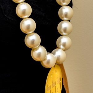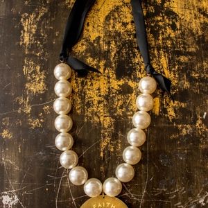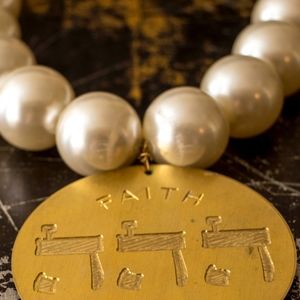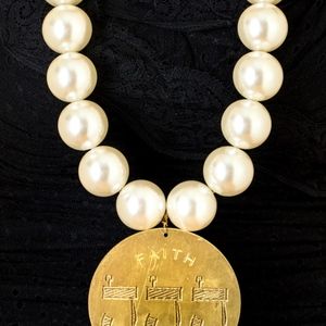 Giant faux pearl necklace with medallion, faith and share