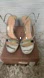 Left heel is in perfect condition. Right heel would need repairing on bedazzled strap. Right heel also has some discoloration on heal + toe area. Comes with box & two extra heel studs. (See all photos + video ft right heel please.)