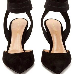Elegant black suede pointed-toe pumps with signature Gianvito Rossi logo elastic ankle bands—chic and supportive. Surprisingly comfortable for a heel. Versatile enough to dress up or down.