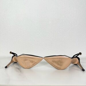 Features: A plexi and patent leather pointy slingback with gold-tone ribbon detail at the buckle.