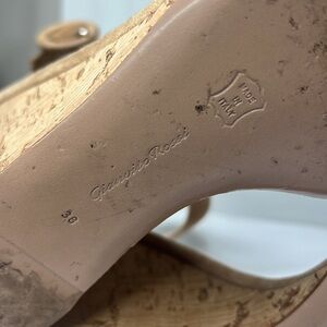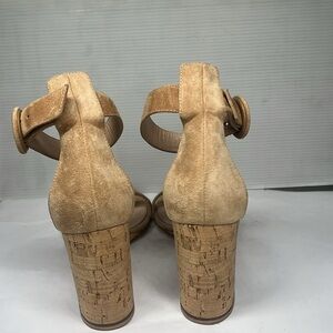 This is a beautiful pair of Gianvito Rossi Sz 38 Nude Suede 3.5” Cork Wedge Sandals. Worn just a few times. Excellent condition, no issues at all. Adjustable ankle strap.