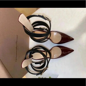 NWT Comfy insole. This is as seductive as they come. Italian designs Rossi was impeccable with this shoe. It’s a forefront of fashion. It’s modern and stand out style will definitely be the talk of the room. Color is called grape the straps are in a black leather with silver hardware. Not only an accessory for your feet but also for your legs.