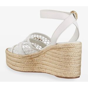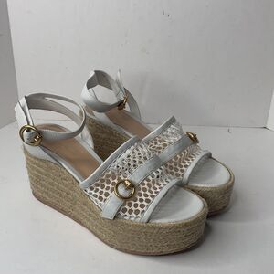 Giavito Rossi white leather platform wedge sandals with ankle strap and open toe. Smooth and perforated netting vamp with leather strap and gold buckle detail. Adjustable ankle strap with gold buckle. Jute braided platform and wedge heel. Leather lining, footbed and rubber sole. Excellent condition.