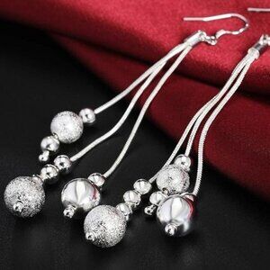 Captured by three gorgeous strands, these sparkling silver balls are accompanied by highly polished counterparts to create a sweet, enchanting look in these dangling earrings.