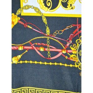 This is a button front women's dress with lots of color. It is equestrian in nature with horse harness built into the pattern. This piece is made in the U.S.A. It does not have a material tag that I can find but this is very soft and has lots of movement so I am guessing polyester. It is 26" from armpit to armpit and 42" from shoulder to hem. It is in very nice pre-owned condition.