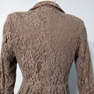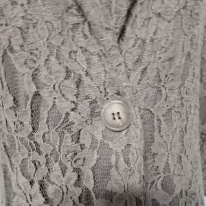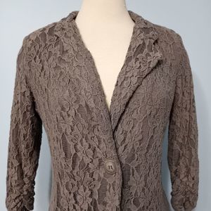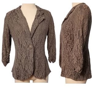 Elegant lace blazer. Single button closure. Three-quarter sleeves. Perfect for formal occasions.