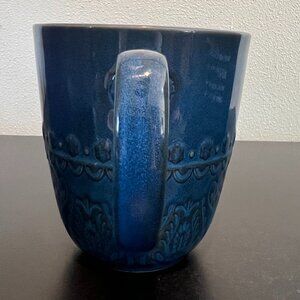 Glossy blue glazed stoneware mug with an intriguing black embossed damask pattern of elaborate and symmetric floral medallions that wrap around the exterior and draw the eye in to take a closer look. Sophisticated black matte finish interior and rim. Large and comfortable easy-to-grip handle. Dishwasher and microwave safe. Measures 4.25” tall with a 3.75” diameter; 5.25” across including handle. Holds 16 fluid oz. Elite pattern by Gibson.