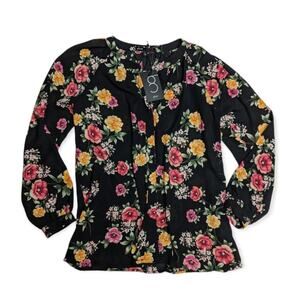Gibson Floral Black Blouse Fleur Bloom Blouson Sleeve Button Top Casual New XS