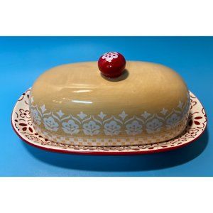 Gibson General Store Butter Dish Ceramic 2 Piece Red Beige Cherry