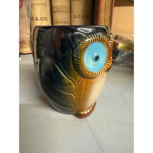 • Sculpted 3D owl face with bright turquoise eyes and earthy brown ombré tones