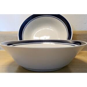 From a smoke free home, blue striped cereal or salad bowl from Gibson Housewares. Set of 2, each measures 2 inches in high and about 6 3/4 inches in across. Good used condition.