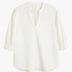 Elegant white blouse with a V-neck. Features three-quarter sleeves with button closure--extra button included internally on tag. Perfect for casual or formal wear.