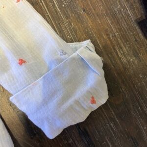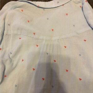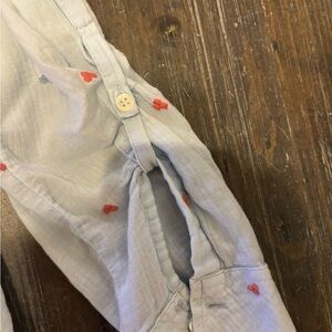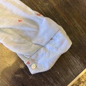 Adorable light blue Blue Gibson Latimer Button-up shirt with collar and embroidered pink and blue dot details, long sleeves with roll-up 3/4 sleeve button option, single pocket