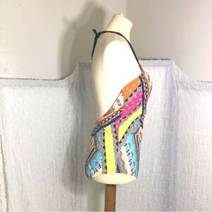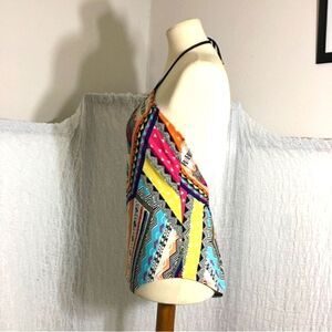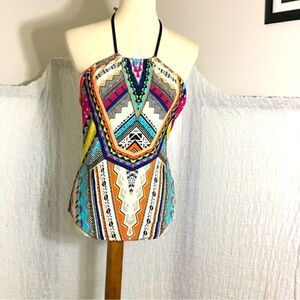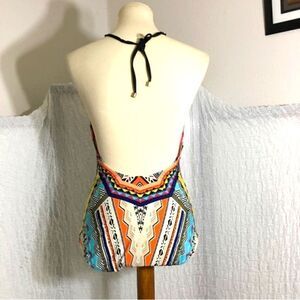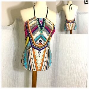 Beautiful multi-colored boho print one piece swimsuit. Halter top and open back style. Pre-owned in good condition. Please refer to pictures for best description and condition verification.