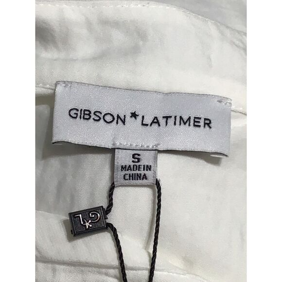 This Gibson Latimer blouse features a cream hue with a mandarin collar, long sleeves, and a single chest pocket, offering both style and utility. Lightweight polyester ensures a flowing fit, making it suitable for various occasions.