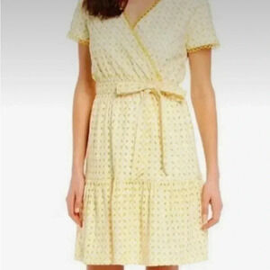 Gibson Latimer white with yellow embroidery dress, pullover, v-neck dress with ruffle hem, elastic waistband, sash belt, fully lined, NWT, smoke free home.