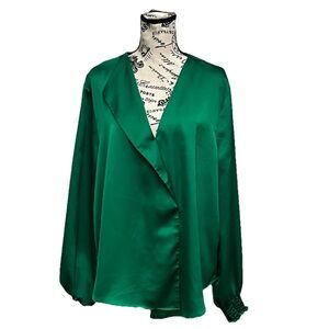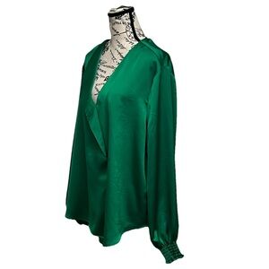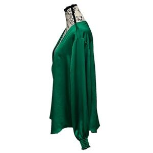 The Gibson & Latimer Kelly Green Satin Tunic Blouse is a versatile and stylish piece perfect for various occasions. This blouse features a flattering V-neckline, long puff sleeves, and a solid green color, with a hint of hippie, boho, and preppy styles. Made from lightweight and breathable polyester satin, this blouse is easy to care for and suitable for all seasons. The XL size fits a regular fit, making it comfortable for everyday wear or a party or work event. Perfect for the woman who wants to make a statement with a colorful and trendy blouse.