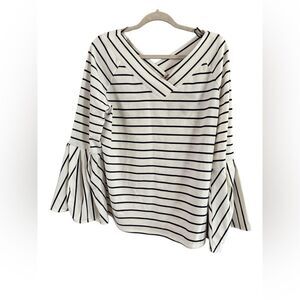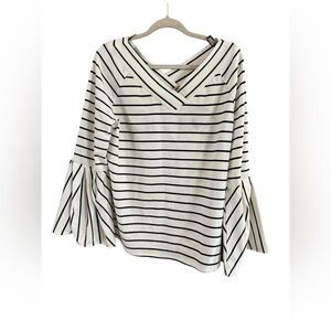 New with tags, Gibson Latimer V-neck top, size large. Features a V-neck in the front and back, blue and white stripes, and bell sleeves. The design is 55% polyester, 40% rayon, and 5% spandex. Machine washable. A292 #fairycore