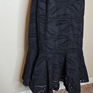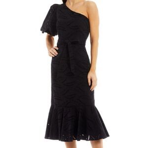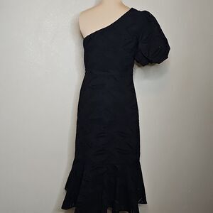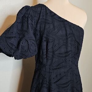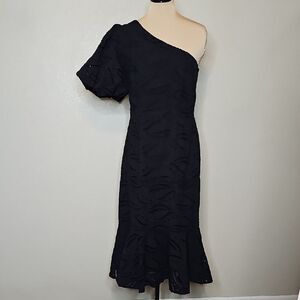 Gibson + Latimer Medium Eyelet Black One Shoulder Puff Sleeve Midi Dress in excellent condition. NO belt included. Step out in style with this elegant black one-shoulder dress. Perfect for any occasion, this dress combines sophistication with a modern twist.