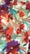 Colorful floral V-neck top. Features vibrant patterns with a mix of purple, orange, and green.