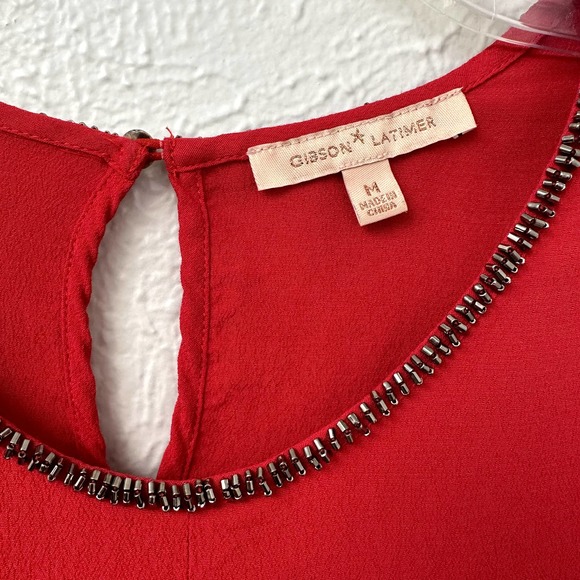 This is a lovely shirt by Gibson Latimer. This is a red blouse with a beaded neckline. This blouse closes in back with a button that creates a keyhole detail. Long sleeved blouse with elastic around arm holes.