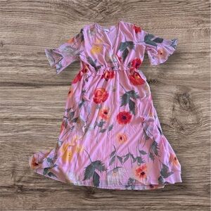 This charming floral pink dress is perfect for any occasion. Gibson & Latimer floral dress, likely a midi or maxi style due to its length. The dress features a pink background with a print of red, orange, and yellow poppies, along with green foliage. It has short, ruffled sleeves and an elasticized waist, suggesting a comfortable and flowy fit. Based on search results, Gibson & Latimer offers various floral dresses with similar features, including wrap silhouettes, tiered skirts, and long blouson sleeves. These dresses are often made from woven poplin or crepe fabrics and are available at retailers like Dillard's. The specific style in the image appears to be a casual yet elegant option, suitable for spring or summer event