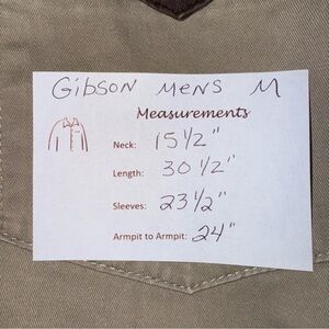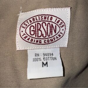 men’s western shirt, Gibson Trading Co. button up, two-tone beige and brown long sleeve shirt, cowboy ranch rodeo style, snap front closure, collared western wear, contrast yoke design, chest flap pockets, rugged casual shirt, country western rodeo fashion, durable cotton blend shirt, classic cowboy western look, men’s ranch work shirt, rustic country outfit, vintage western style shirt, versatile casual wear, pearl snap button shirt, rodeo cowboy cowboycore fashion, men’s country western wardrobe staple