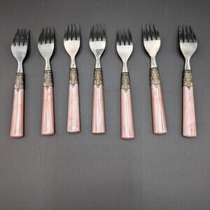 Gibson Roseland Salad Forks Set of 7 Pearlescent Pink Handles Ornate Vintage
