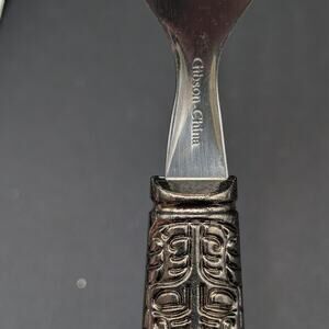 Finish/Details: Silver-tone metal fork heads with ornate, relief-pattern ferrules/collars