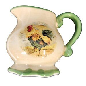 This Gibson Rooster Pitcher is a stylish ceramic creamer intricately hand painted with a vibrant green trim. Standing 3.75 inches tall, it's both dishwasher and microwave safe.