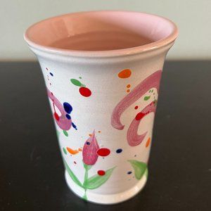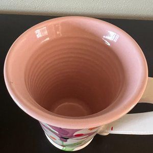 Tall and beautiful off white mug embellished with hand painted long stemmed purple irises and artistic paint splashes of color in eye catching and vibrant colors. Ribbed interior in lilac pink. Footed bottom with flared shape. Comfortable and stylish, flattened question mark shaped handle.
