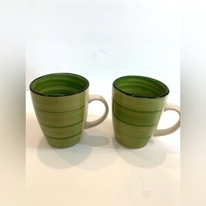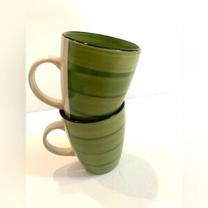 2 Green Mugs are dishwasher, oven, and microwave safe. Any imperfections are original within the making of the individual mug (see pictures) and do not compromise the integrity of the mug. Excellent condition.