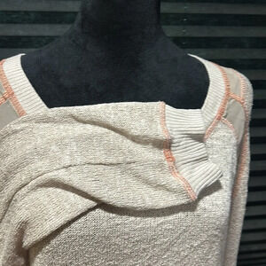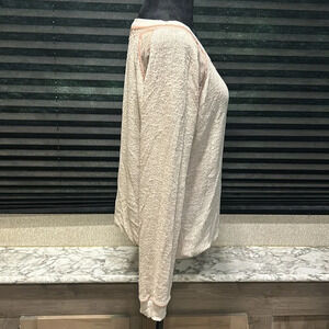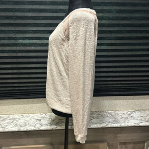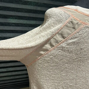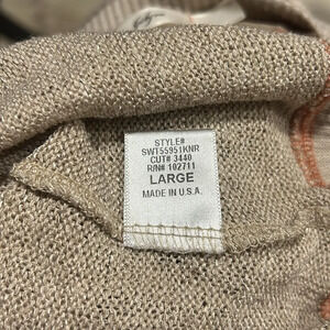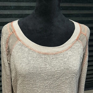 Gibson women’s tan top. Long sleeve. Ribbed neck, cuffs and hem. Lightweight knit. Orange stitching. Chiffon accents. Rayon/ poly/ spandex blend. Size Large
