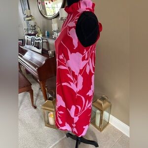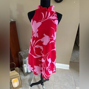 GIBSON x Hi Sugarplum! Red Pink Print Cavallo Ruffle Neck Mini Tie Neck Dress