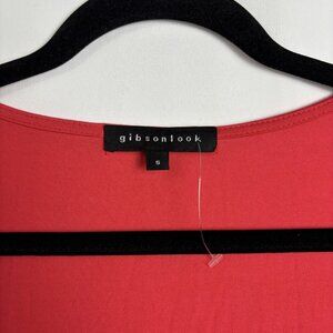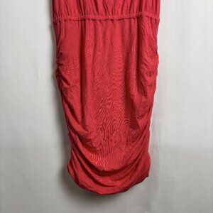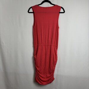 This is a Gibsonlook dress in size small. This is a beautiful dress in a bright, coral-like red color, with a very classy square neck shape and no sleeves. This dress has ruched sides below the fitted waist line, and the material has unbelievable softness from the 95% rayon composition. The 5% spandex adds an excellent and comfortable degree of stretch to the material to make movement natural and to improve it's wearability and versatility. This dress is an excellent choice for casual and formal occasions, and it viable in all seasons! This dress is about midi length I estimate, and it is in excellent pre-loved condition!