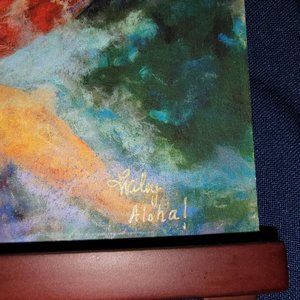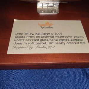 Circa 2009 Giclee Print of 'Koi Party' by Lynn Wiley on archival watercolor paper, under beveled glass, metal clipped on wood easel, hand signed, original done in soft pastel. Approx. measurements including easel: 6" tall x 6 1/2" wide. Brilliantly colored koi. Inspired by Psalm 97:1. Good preowned condition. Please see photos. The photos are part of the description. Unable to bundle.