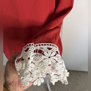 Small burnt orange open-front cardigan features elegant lace accents and tassel perfect for enhancing your style this fall or any outfit.