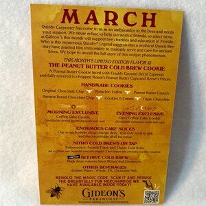 This is a unique and collectible menu art card featuring Quinby Carpenter from Gideon's Bakehouse in Disney Springs. The card measures 4"x6" and is from the month of March 2025. It is a perfect addition to any Gideon's Bakehouse collection. It is a must-have for any fan of the franchise.