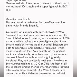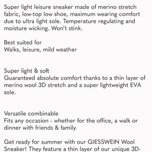 Lightweight wool knit low profile sneaker. Light sole discoloration, no insole, otherwise no flaws. Sweat absorption, without the stink. Manufacturer description in pix.