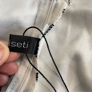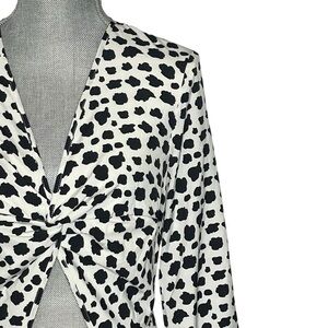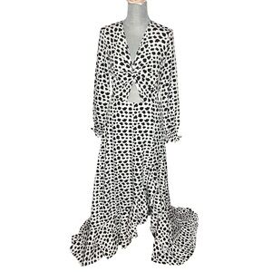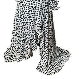 Stylish Boho All Over Black and White Print and white dress with a Chic Twist Front Design, Ruffle, Tiered Layer, Cut Out & Ruffle Hem. Long Sleeves w Elastic at Cuffs. No Stretch in Fabric Shoulder 16”, Bust 33 inches, Waist 29 inches, length 54 inches, Hips 36”, Sleeve 23”