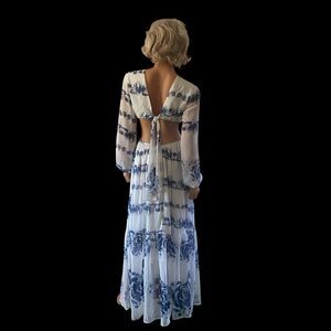 Style tags: boho, bohemian, floral, beach, resortwear, vacation, travel, cut out, ruffle, flounce, feminine, lightweight, summer, spring, bishop sleeve, flowy, romantic, cottagecore, chic, contemporary, pastel, statement, trendy, maxi dress